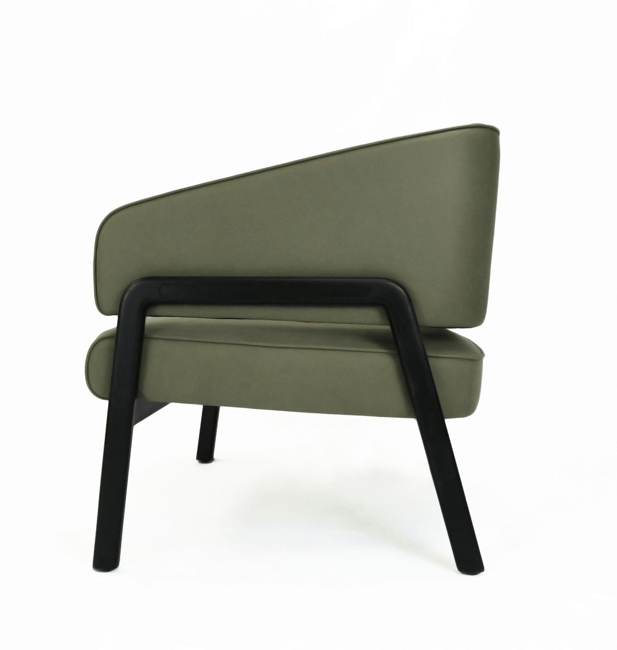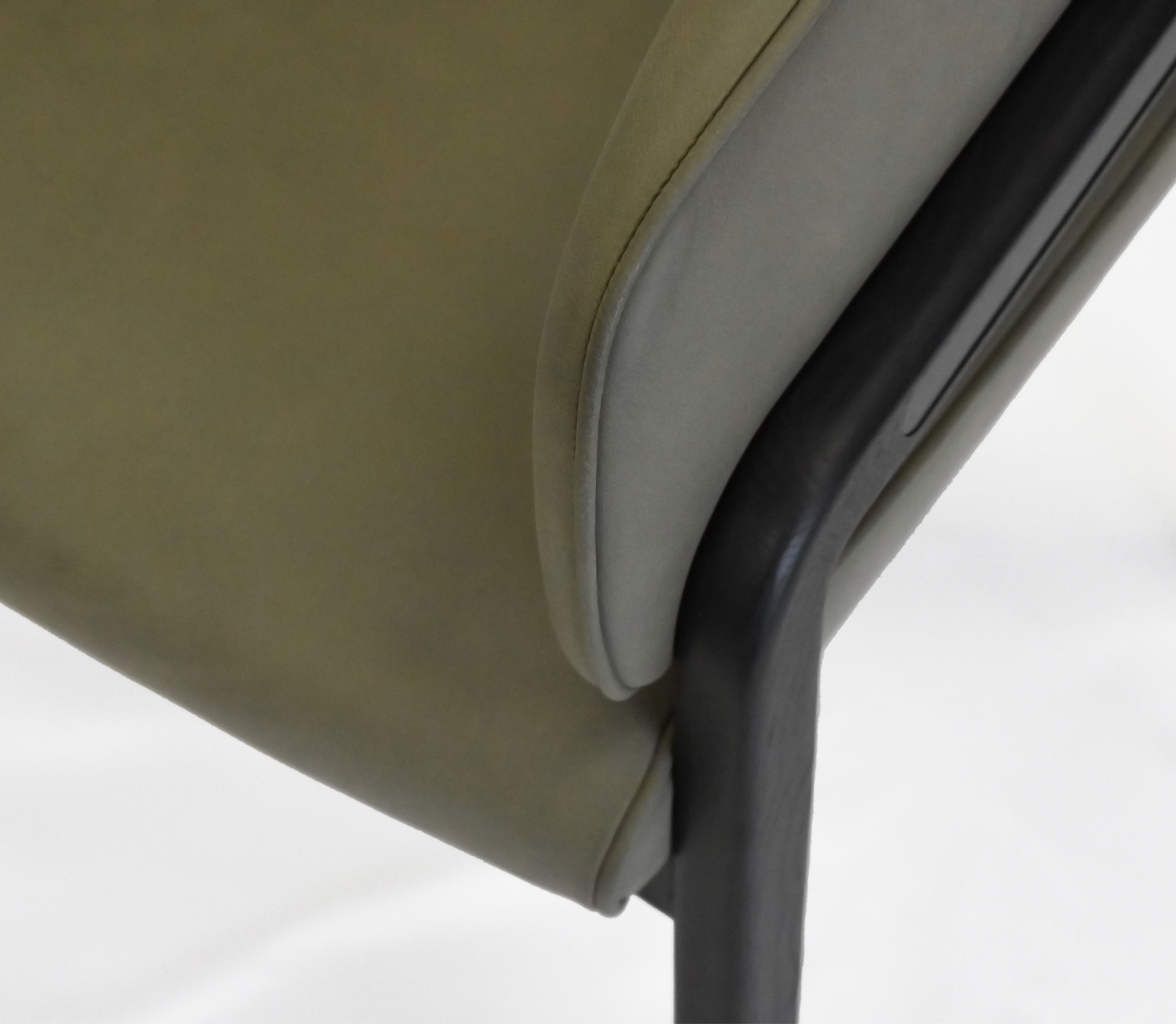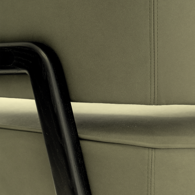The wooden frame draws the side of the collection, and features a leather detail that hides the junction with the backrest.