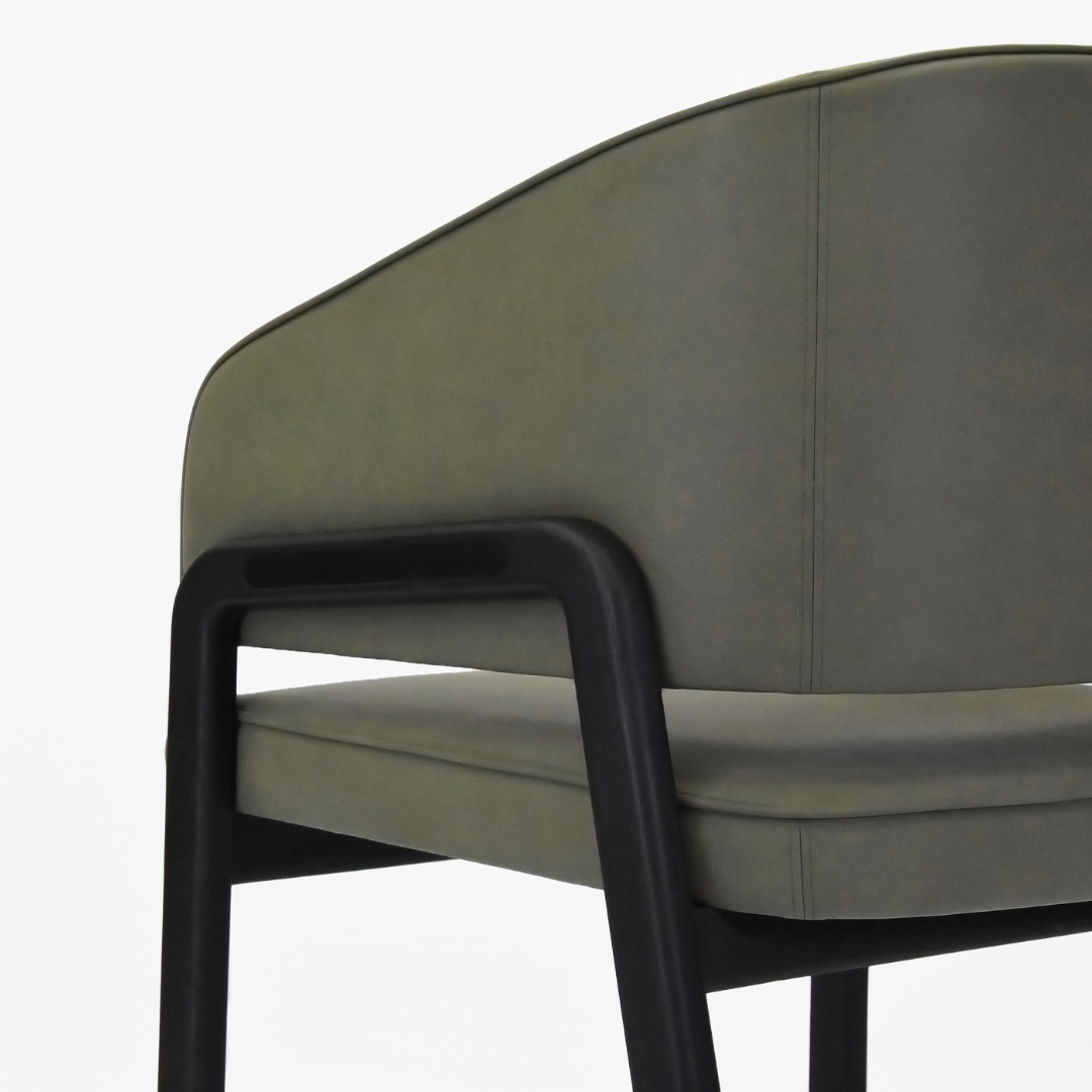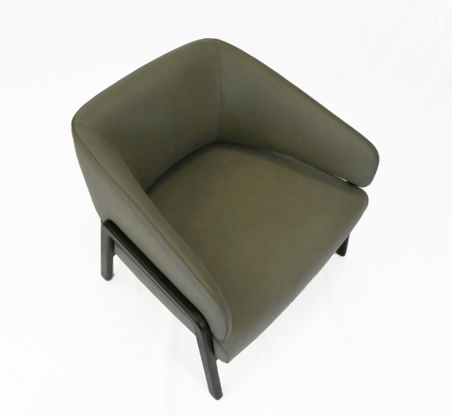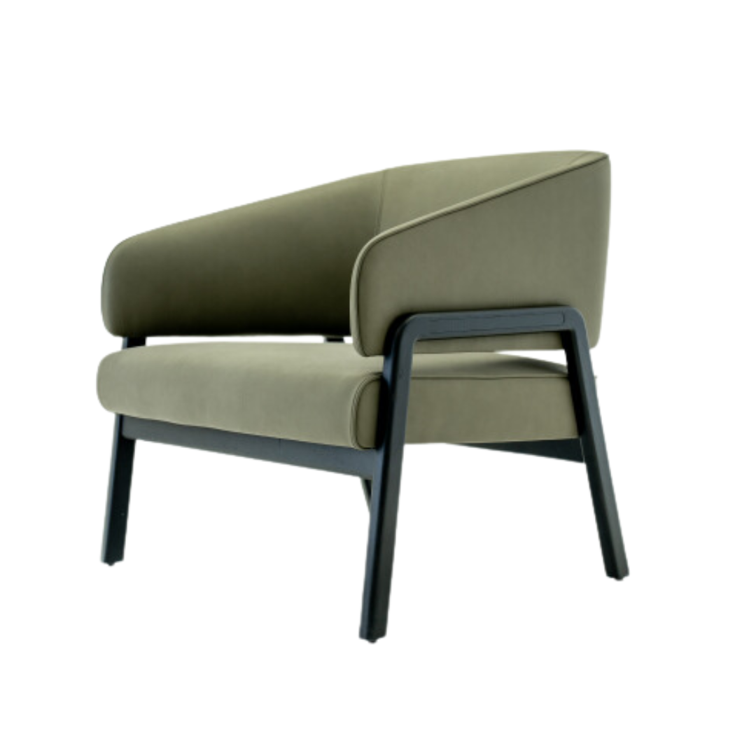 The wooden frame draws the side of the collection, and features a leather detail that hides the junction with the backrest.